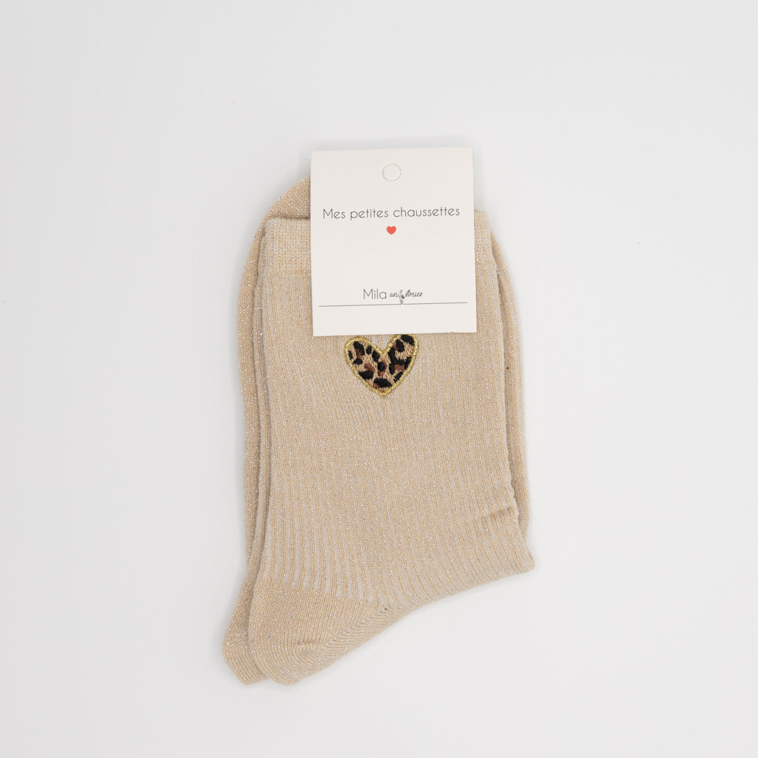 Breng wat pit in je outfit met deze elegante sokken! De subtiele zilveren spikkels zorgen voor een sprankelend effect, terwijl het hartje in tijgermotief een speelse twist toevoegt. Perfect om je dagelijkse look nét dat beetje extra te geven!