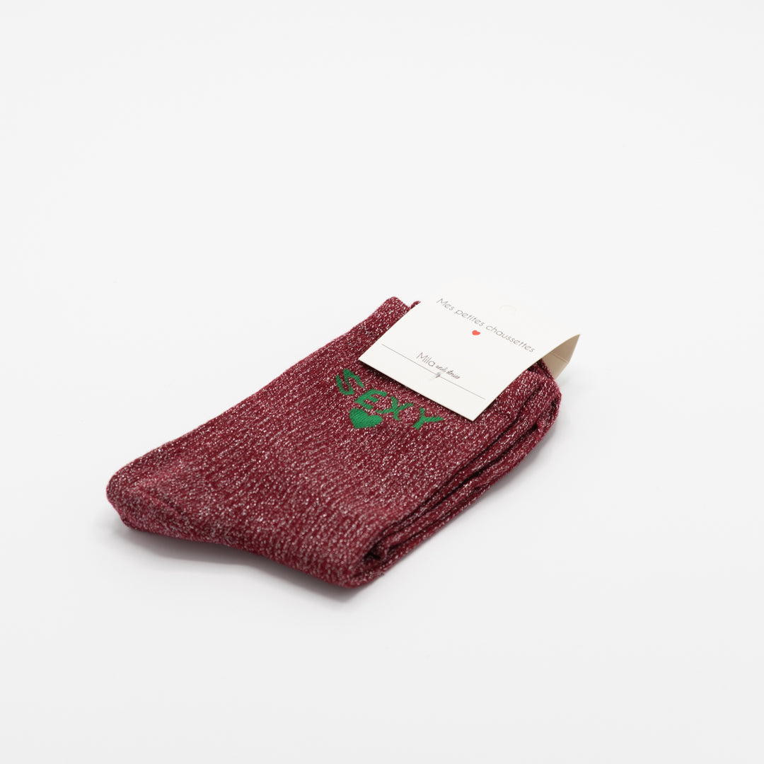 Bordeauxrode hippe sokken met opschrift SEXY