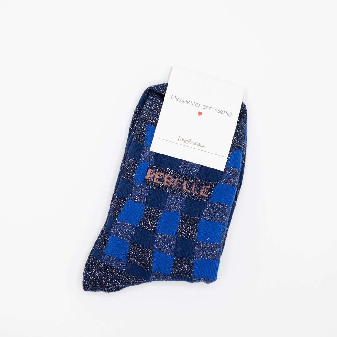 Donkerblauwe, hippe sokken met opschrift REBELLE