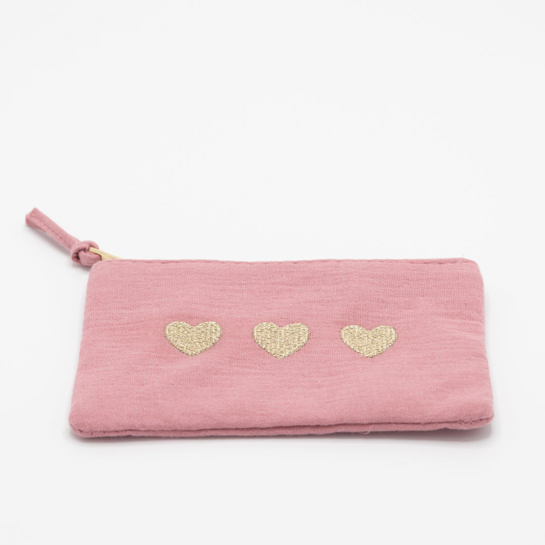 Dit etui met gouden hartjes straalt eenvoud, elegantie en liefde uit. Perfect om je essentials in stijl op te bergen - van make-up tot sieraden of schrijfgerief.