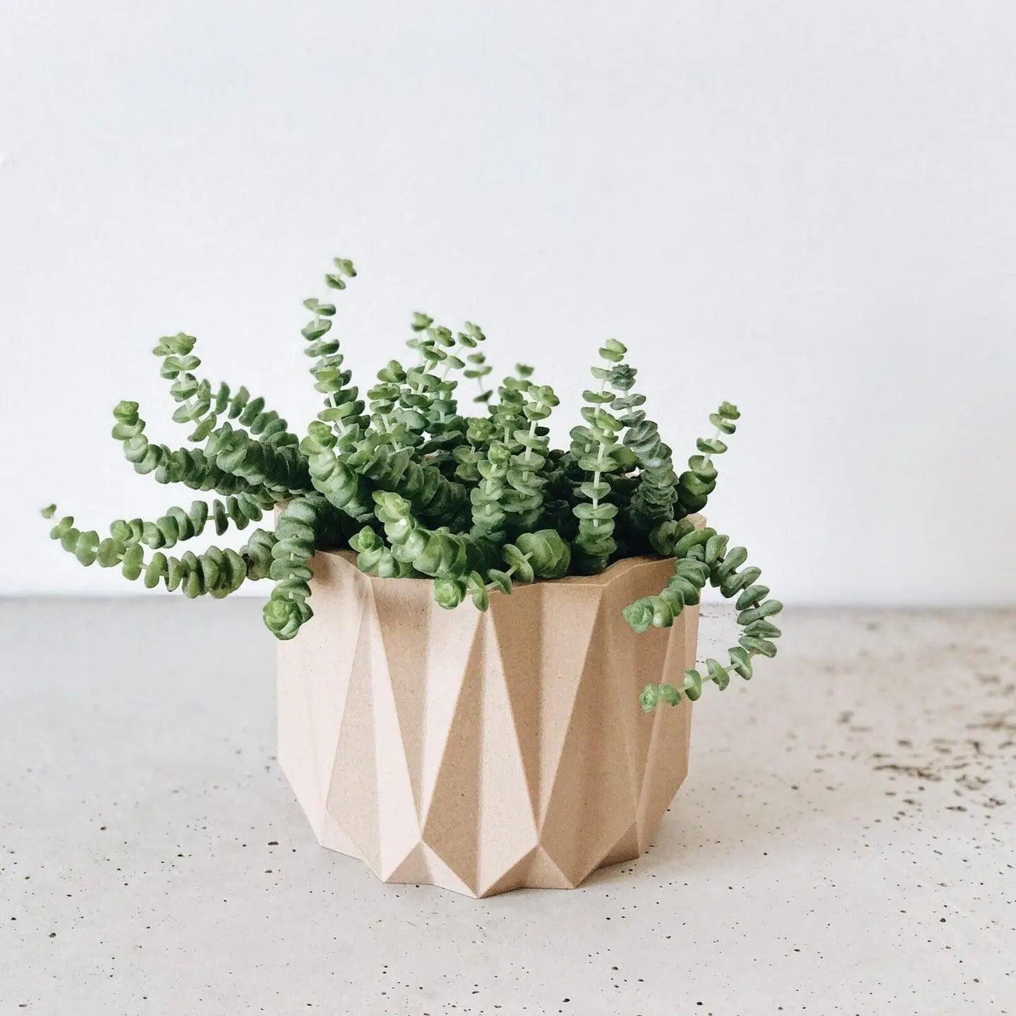 Breng moderne elegantie in huis met deze sierpot, gemaakt van gerecycleerd hout en bioplastic op basis van maïs. Deze minimalistische sierpot is geïnspireerd op origami-kunst en is perfect voor vetplanten en cactussen en geeft een zen, Scandinavisch tintje aan je ruimte.