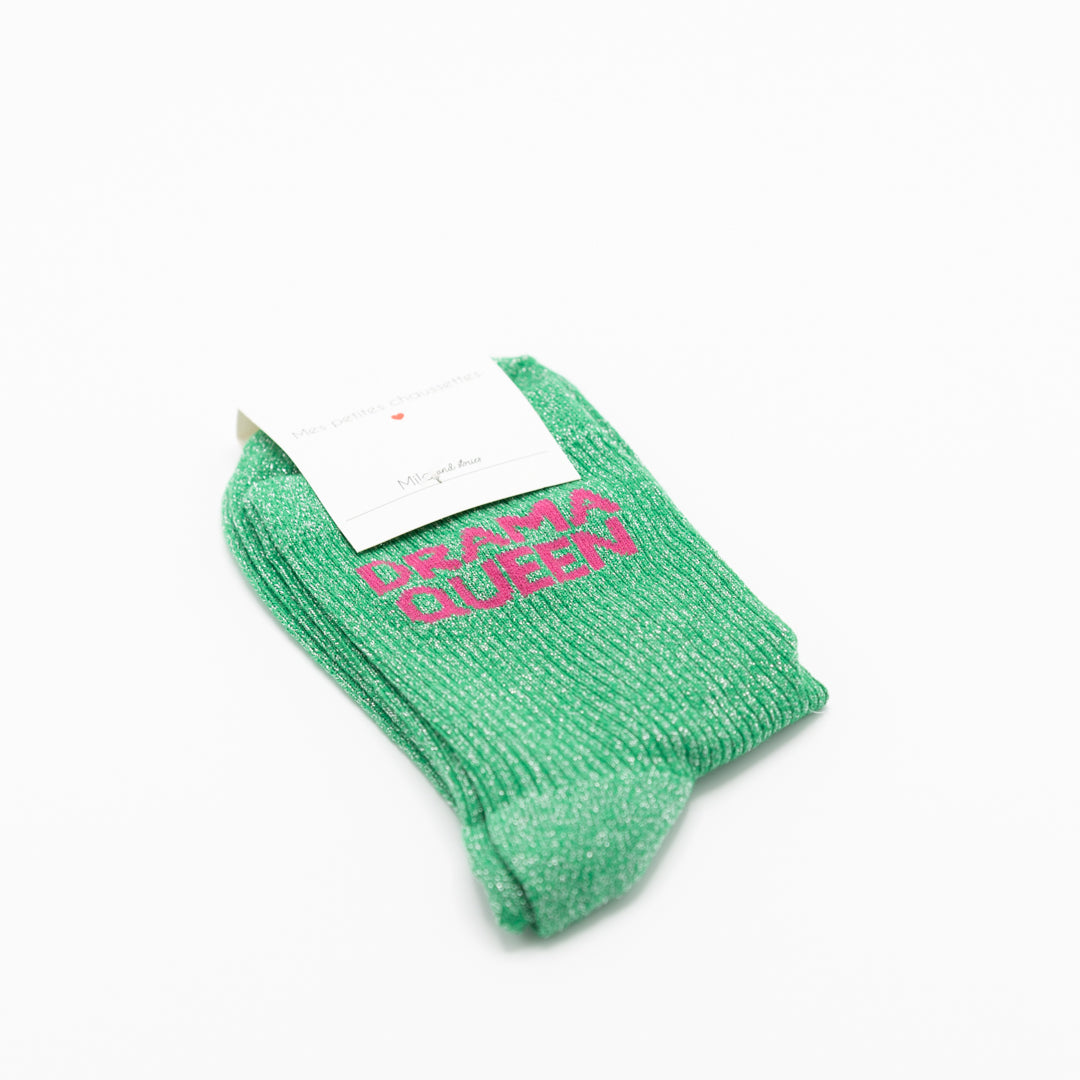 Groene hippe sokken met opschrift DRAMA QUEEN