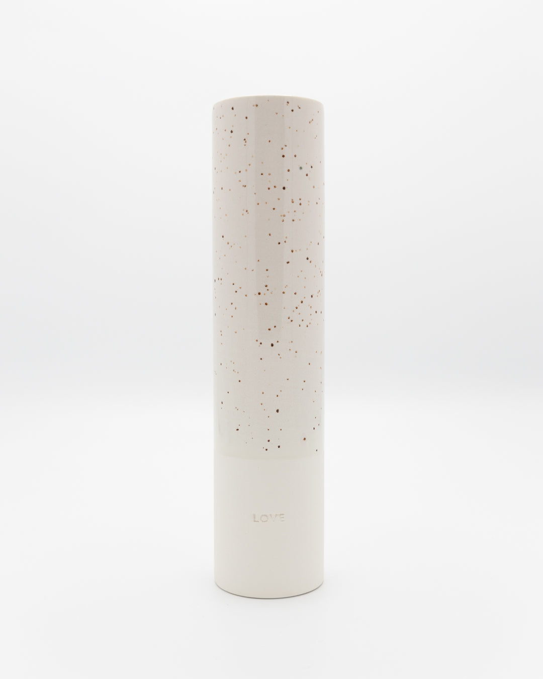 Deze cilindrische, mooie vaas is handgemaakt, half geglazuurd aan de buitenkant en volledig aan de binnenkant. Het heeft bovendien een in blind reliëf opschrift “Love”.