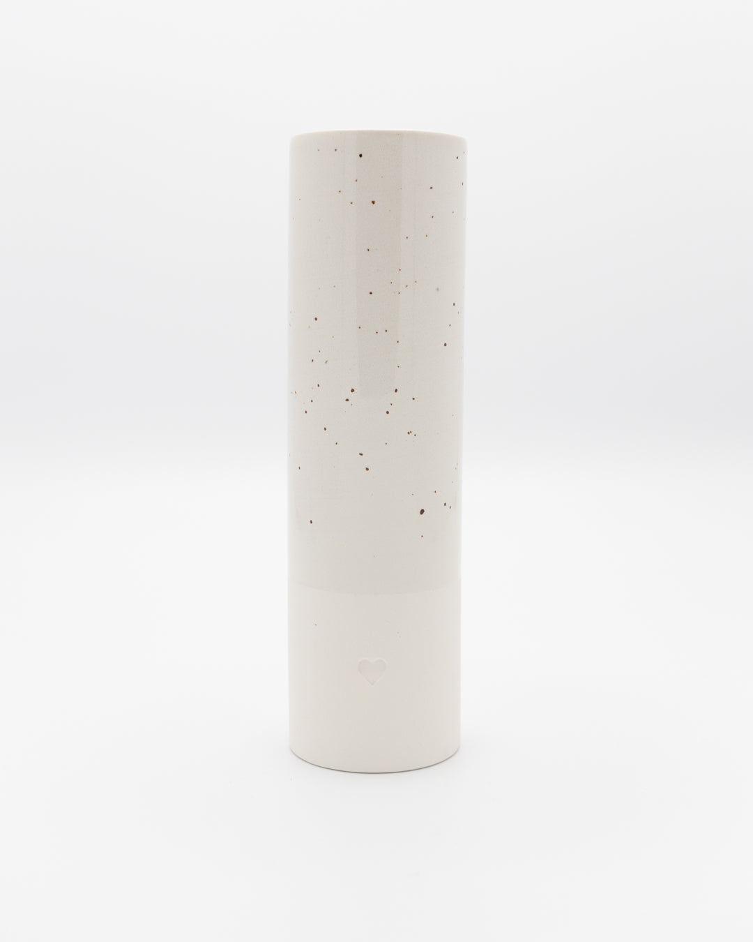 Deze cilindrische, mooie vaas is handgemaakt, half geglazuurd aan de buitenkant en volledig aan de binnenkant. Onderaan vind je een blinde reliëfdruk in de vorm van een hartje.