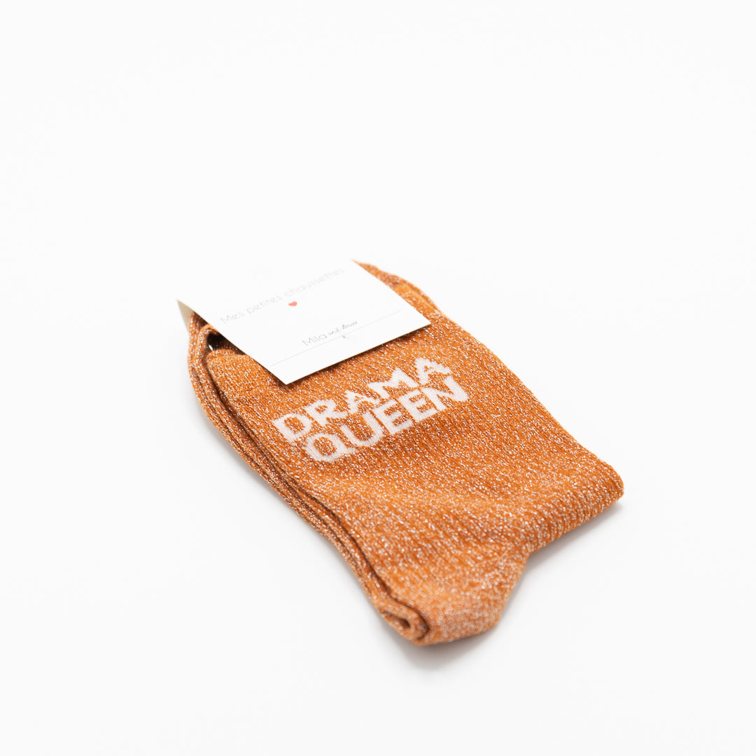 Oranje/camel hippe sokken met opschrift DRAMA QUEEN