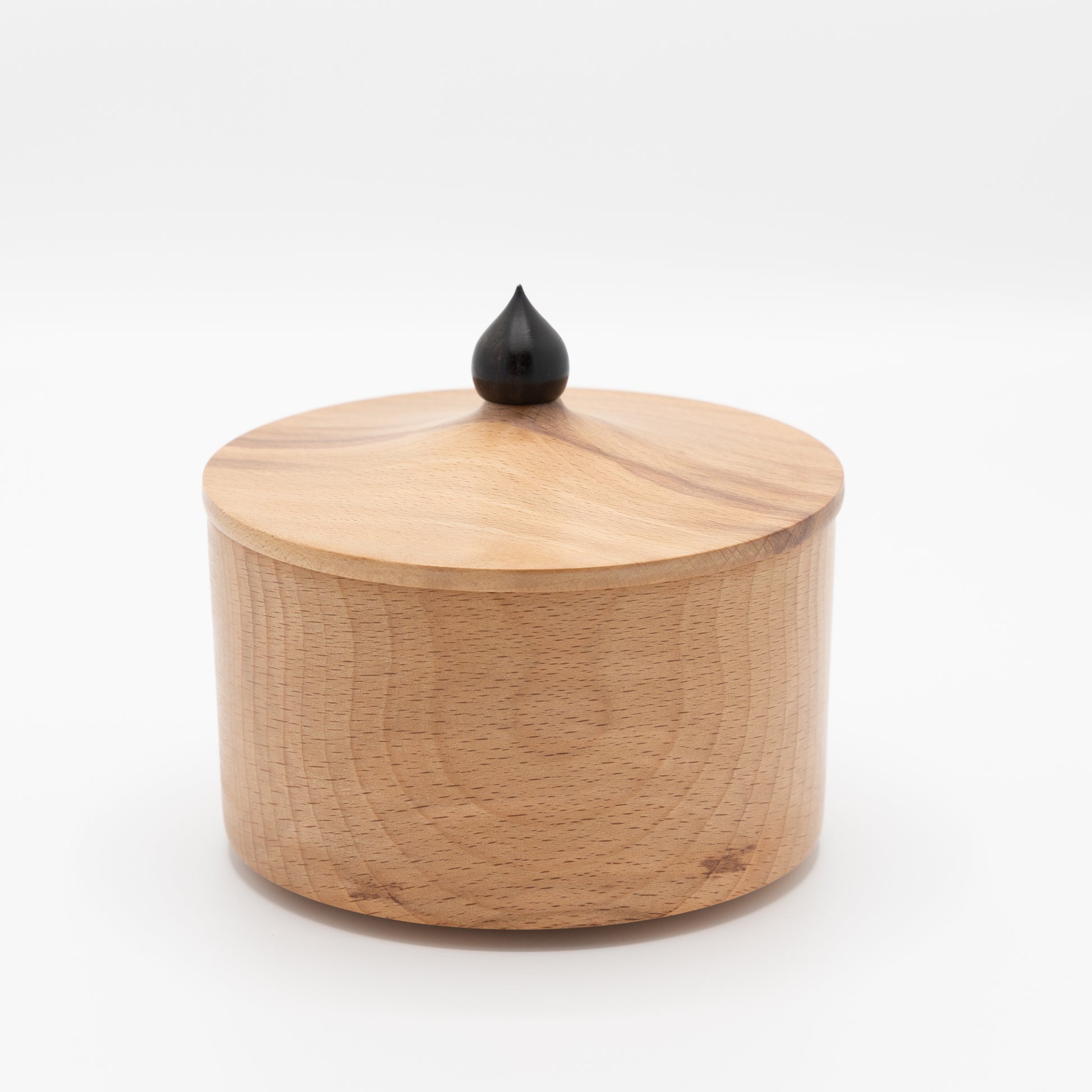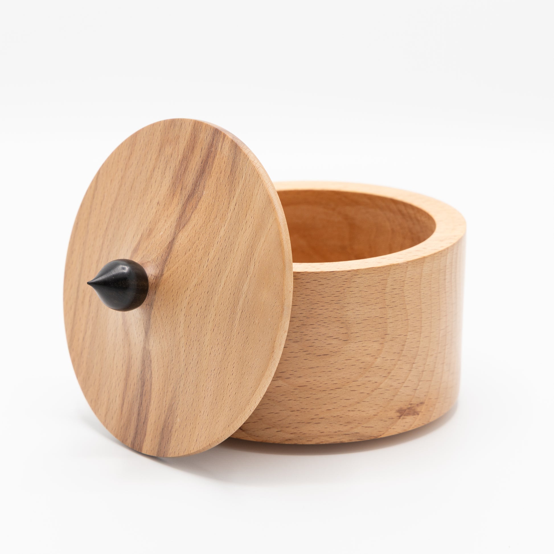 Dit unieke potje is met de hand gedraaid uit massief hout, met zorg afgewerkt en voorzien van een passend dekseltje. Elk exemplaar is uniek – geen twee potjes zijn exact hetzelfde.