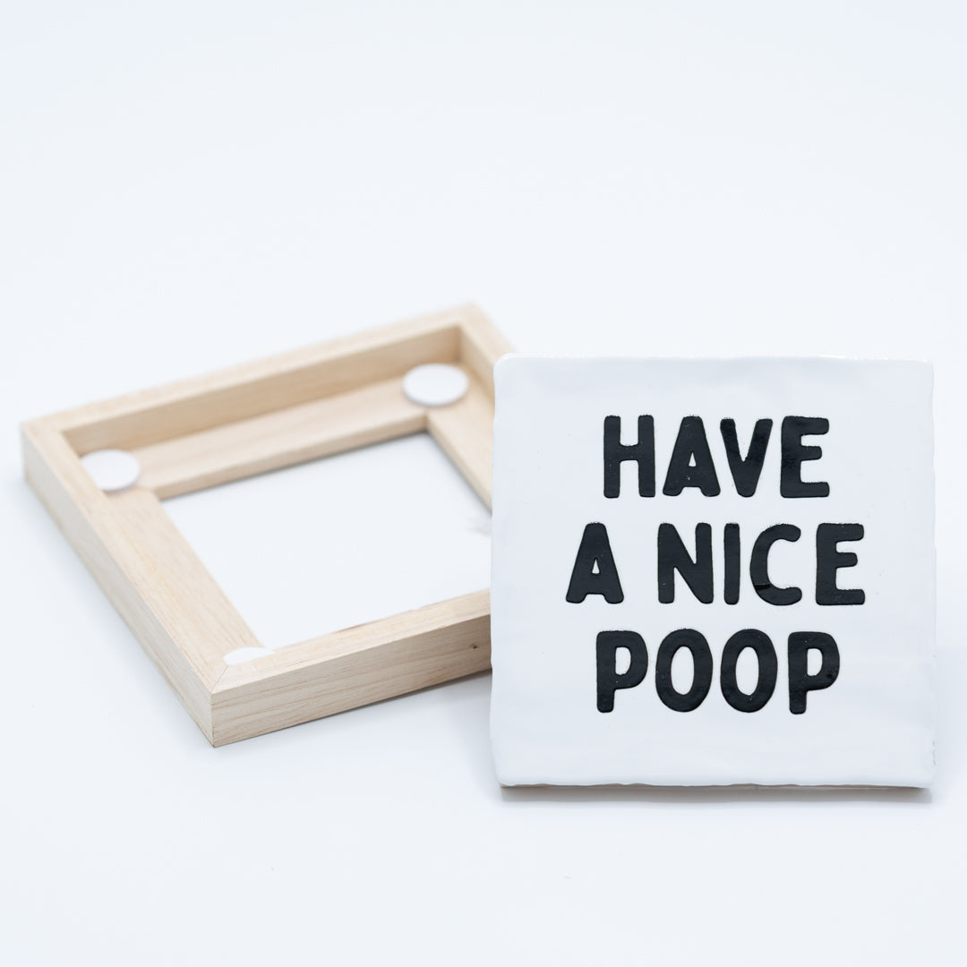 Het tegeltje wordt geleverd met een houten kadertje, zodat je het eenvoudig aan de muur kunt bevestigen. Uiteraard kan je het ook staand gebruiken op het toiletmeubel.