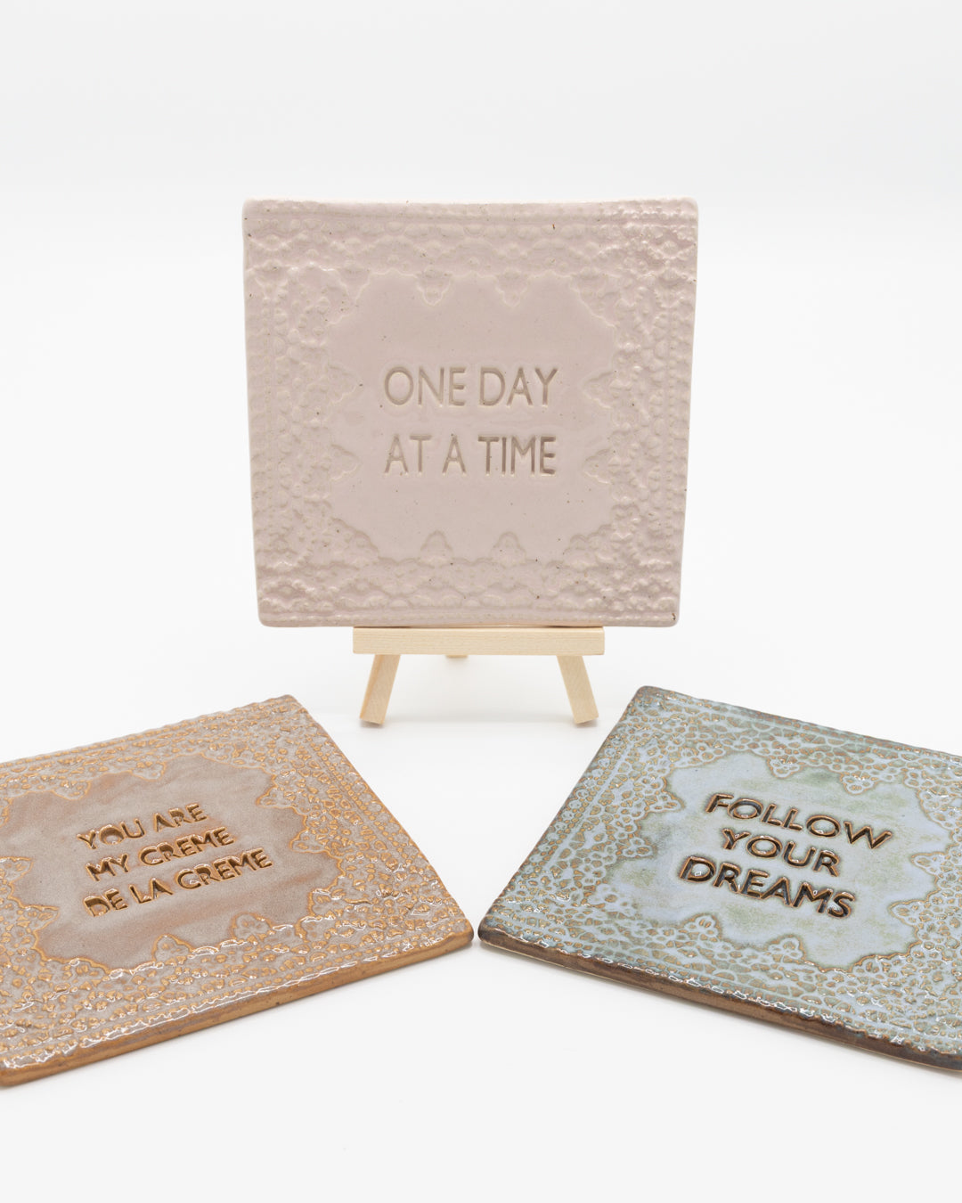 Soms is één dag tegelijk precies genoeg. Deze tegel is een stijlvolle reminder om het rustig aan te doen en te genieten van elk moment. Ideaal voor op jouw werkplek, nachtkastje of woonkamer.