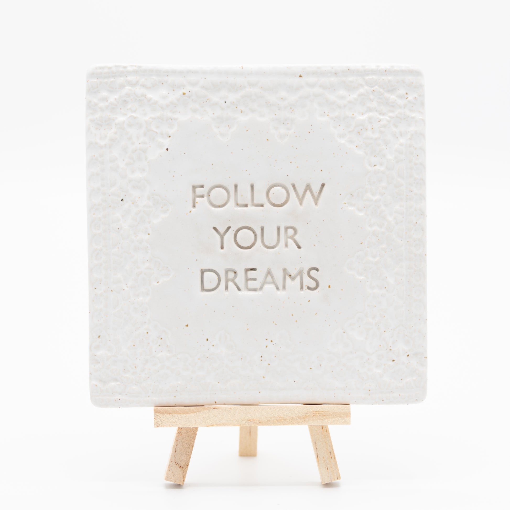Deze tegel is dé reminder om groot te denken en jouw hart te volgen. Een klein gebaar met een groots gevoel. Perfect voor aan je muur, op je bureau of als cadeau voor die ene dromer in je leven.