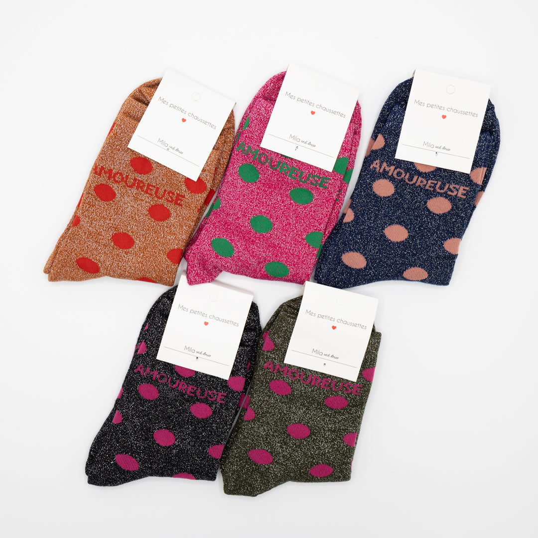 Deze kousen zijn een ode aan de liefde – of je nu verliefd bent op het leven of op iemand anders. Met het speelse opschrift "amoureuse" voeg je een vleugje romantiek toe aan je outfit, van teen tot top.